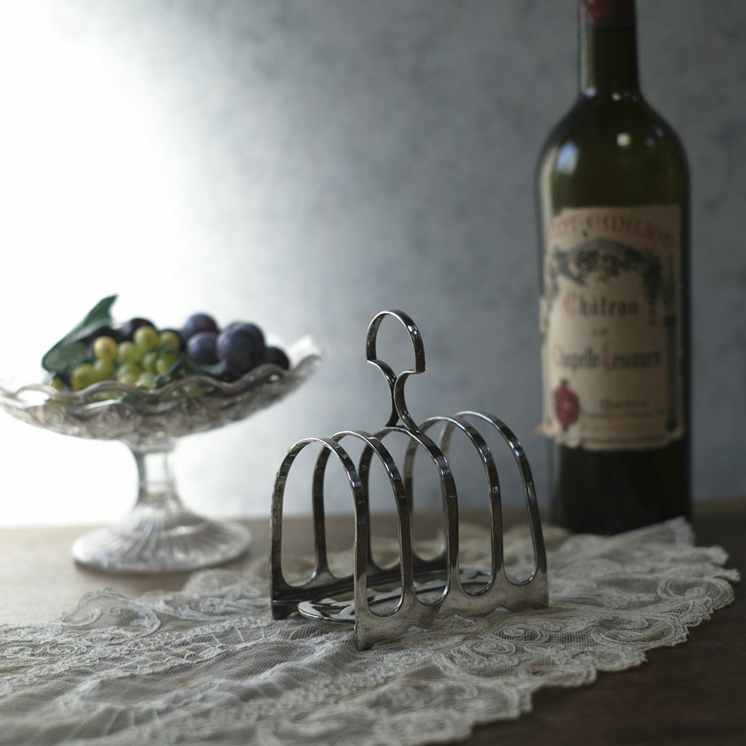 こちらはシルバープレート仕上げのアンティークトーストラックで、朝の食卓やティータイムに、さりげない品格を添えてくれる一品です。焼きたてのトーストを湿気で蒸らさず並べられる実用性はもちろん、ジャムやバター皿と並べたときの雰囲気づくりまで担ってくれるのが、この道具の魅力です。