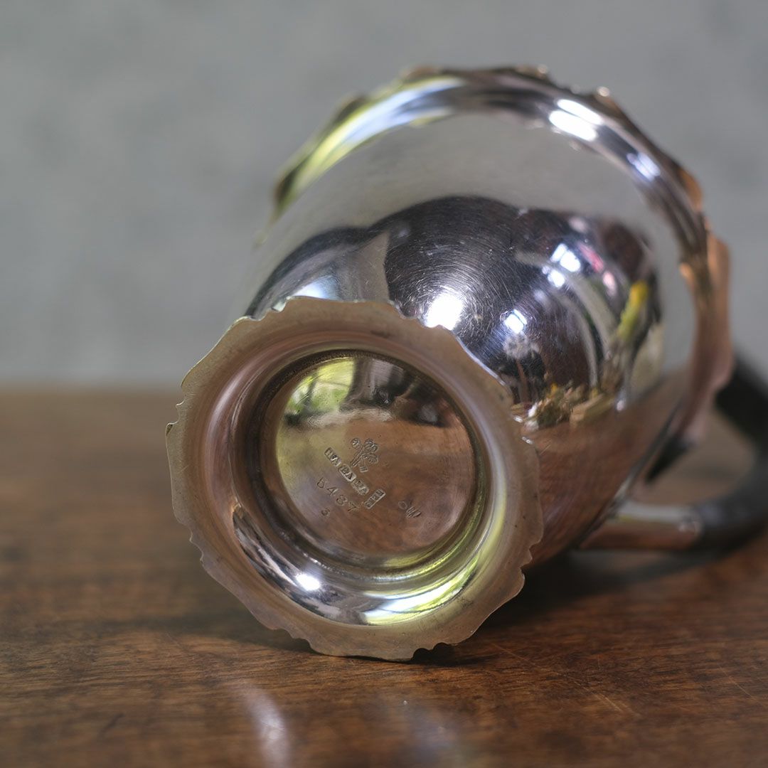 シルバープレートの美しい輝きと、黒檀(エボニー)ハンドルの重厚なコントラストが印象的な、イギリス製のアンティーク・ホットウォータージャグ。