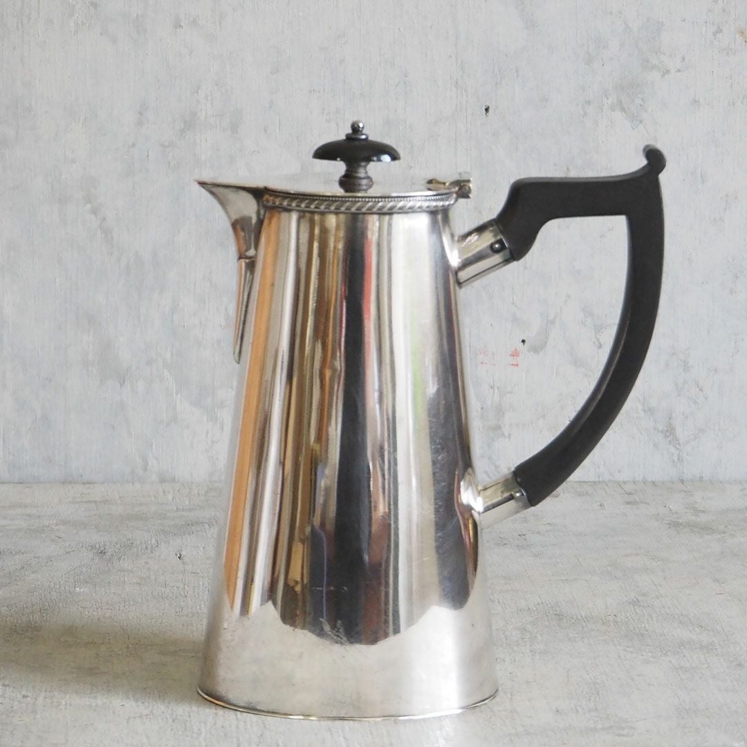 ティーポットとミルクジャグ、シュガーポットと一緒に当時ティーサービスセットして使われていたお湯を注ぐためのホットウォータジャグ。重みやしっとりした艶などに、現在のステンレス製食器にはない魅力に溢れています。