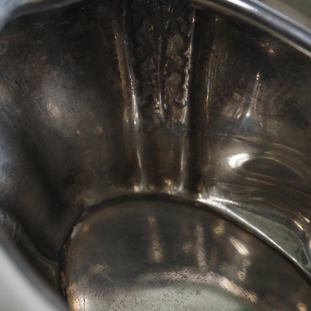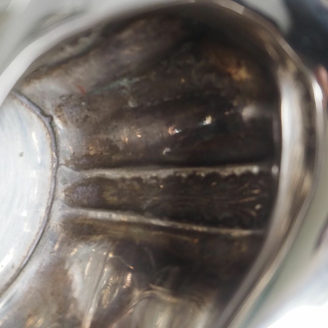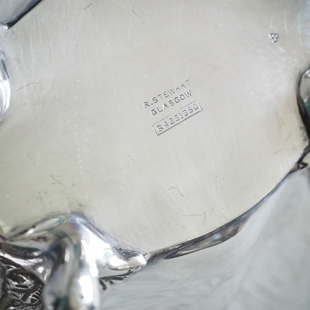 シンプルな造形にシルバーが輝くティーポット、シュガーポット、ミルクジャグの3点セット。舟形に伸びた滑らかなボディに優雅にカーブするエボニーのハンドルがワンポイント。ぽってりと安定感のあるボディに華奢な猫足が素敵です。 バックスタンプはイギリス、スコットランドのグラスゴーのシルバースミス、Robert Stewartによるもの。 ボディに小さな擦れなどありますが、状態は非常に良いです。 ※本商品はシルバープレート商品となります。 アンティーク品のため、経年による細かな傷などはございますが、全体的に状態はとてもキレイで、美しい輝きは今尚も健在です。 【アンティークシルバーテーブルウェアのお手入れ方法】 銀器は手入れが難しいというイメージがありますが、実は毎日のように使っていれば、 特別な手入れは必要なく、使用した後は薄めた中性洗剤液と柔らかなスポンジで普通に洗えばOK。 ただ、たまにしか使わないものなどが黒ずんでしまった場合 は専用のシルバー磨き剤で磨いてください。 表面の酸化が原因なので磨けば綺麗になります。