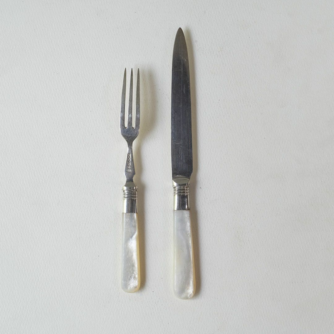 華奢なシルエットと上品な質感が印象的なこのカトラリーは、ヴィクトリア時代に富や洗練の象徴として広く愛されたスタイル。特に白蝶貝のハンドルは、高級品として多くの上流家庭で使用されていました。