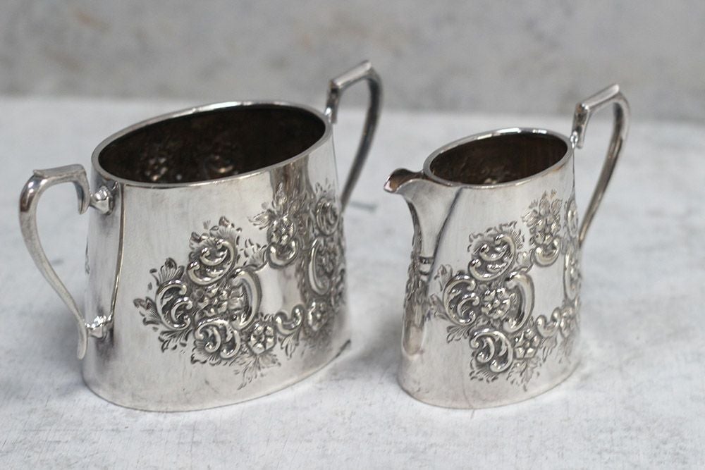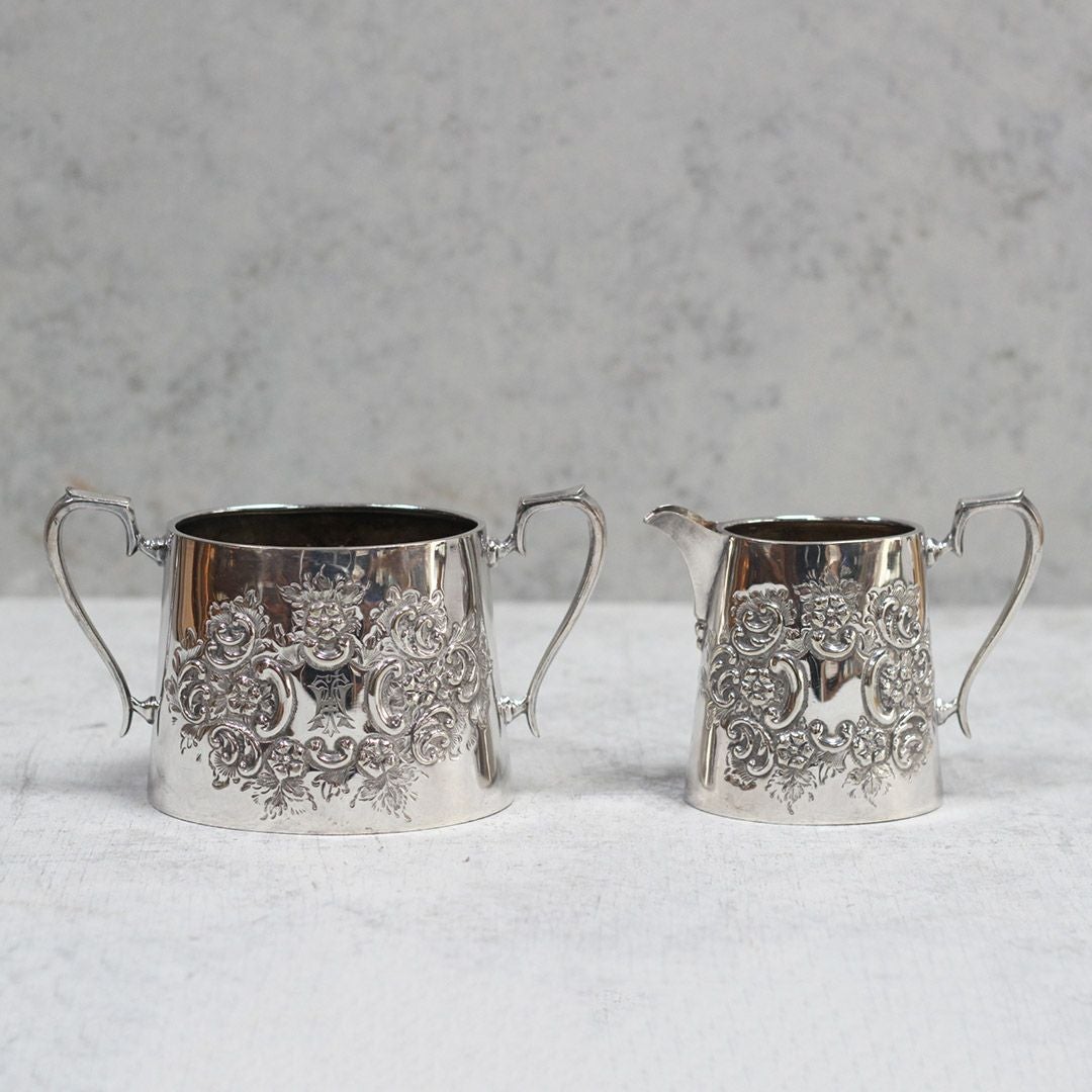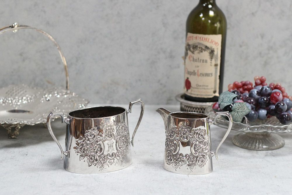 ルプッセ&エーヴィング装飾によって様々な模様が施されたやや大きめのアンティークシュガーポットとミルクジャグ