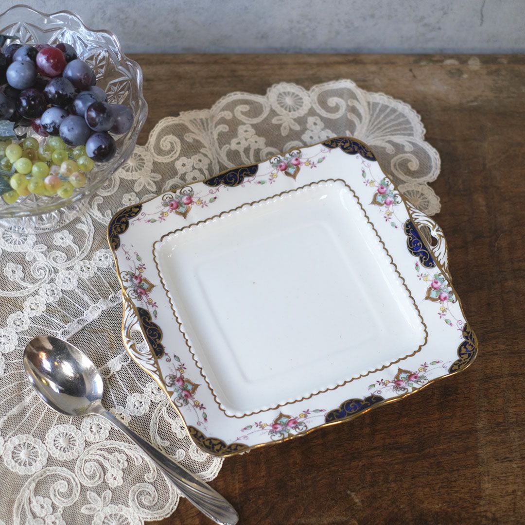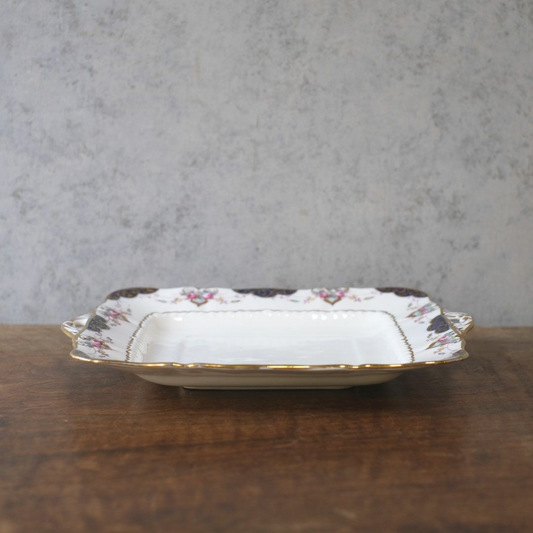 角のやわらかなスクエアフォルムに、さりげない金彩と小花を添えたヴィクトリアン・デザイン。キャビネットに立てかけて飾っても、食卓で実用しても、空間にすっとクラシカルな落ち着きを足してくれる一枚です。