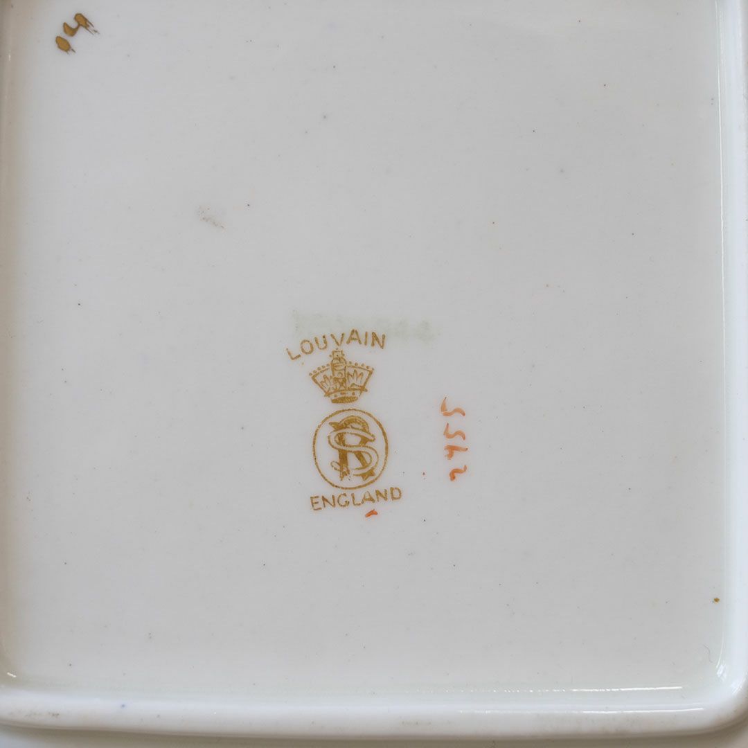 裏面には「LOUVAIN ENGLAND」と王冠マーク、モノグラムのバックスタンプ入りで、コレクションとしても嬉しいポイント。ケーキスタンド代わりに中央に置いたり、フルーツや焼き菓子を並べてサービングトレイとして使ったり、使わない時はキャビネットに立てかけて絵皿のように飾っても素敵です。