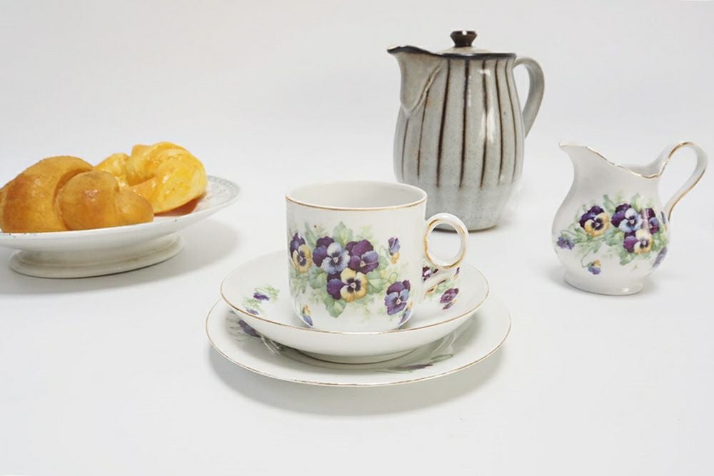 イギリスのティーカップとは雰囲気の違うチェコスロバキア製のカップアンドソーサー可憐なパンジーの絵柄が可愛いvictoriaの、珍しいアイテムです。