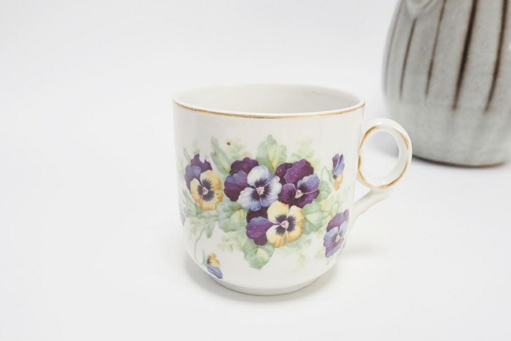 1883年にロンドンの陶磁器会社「Lazarus & Rosenfeld Ltd」が、チェコスロバキアに設立した「Victoria China」の陶器アンティークカップアンドソーサー。色鮮やかな黄色と紫のパンジーが描かれた可愛らしい作品です。