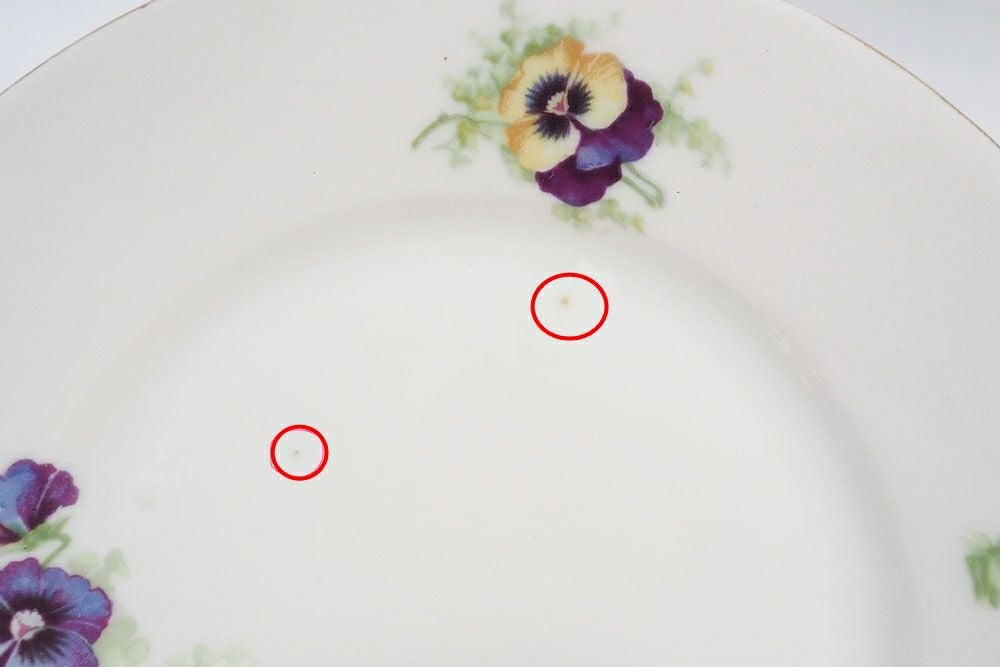 絵柄は転写によるもので、発色は良好です。淵の金彩がところどころ剥げていますが、目立つヒビカケ、割れなどはなく、状態は比較的良好です。