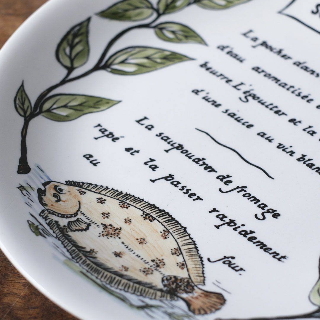 フランス名窯GIEN(ジアン)の、遊び心ある“SOLE MORNAY”(舌平目料理)レシピが描かれたヴィンテージプレート