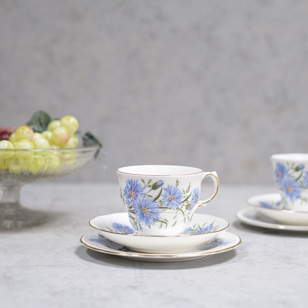 QUEEN ANNE(クイーンアン)によるCornflower(矢車菊)と呼ばれるパターンで爽やかなブルーが白地に映えるデザイン。ヴィンテージのティーカップトリオです。
