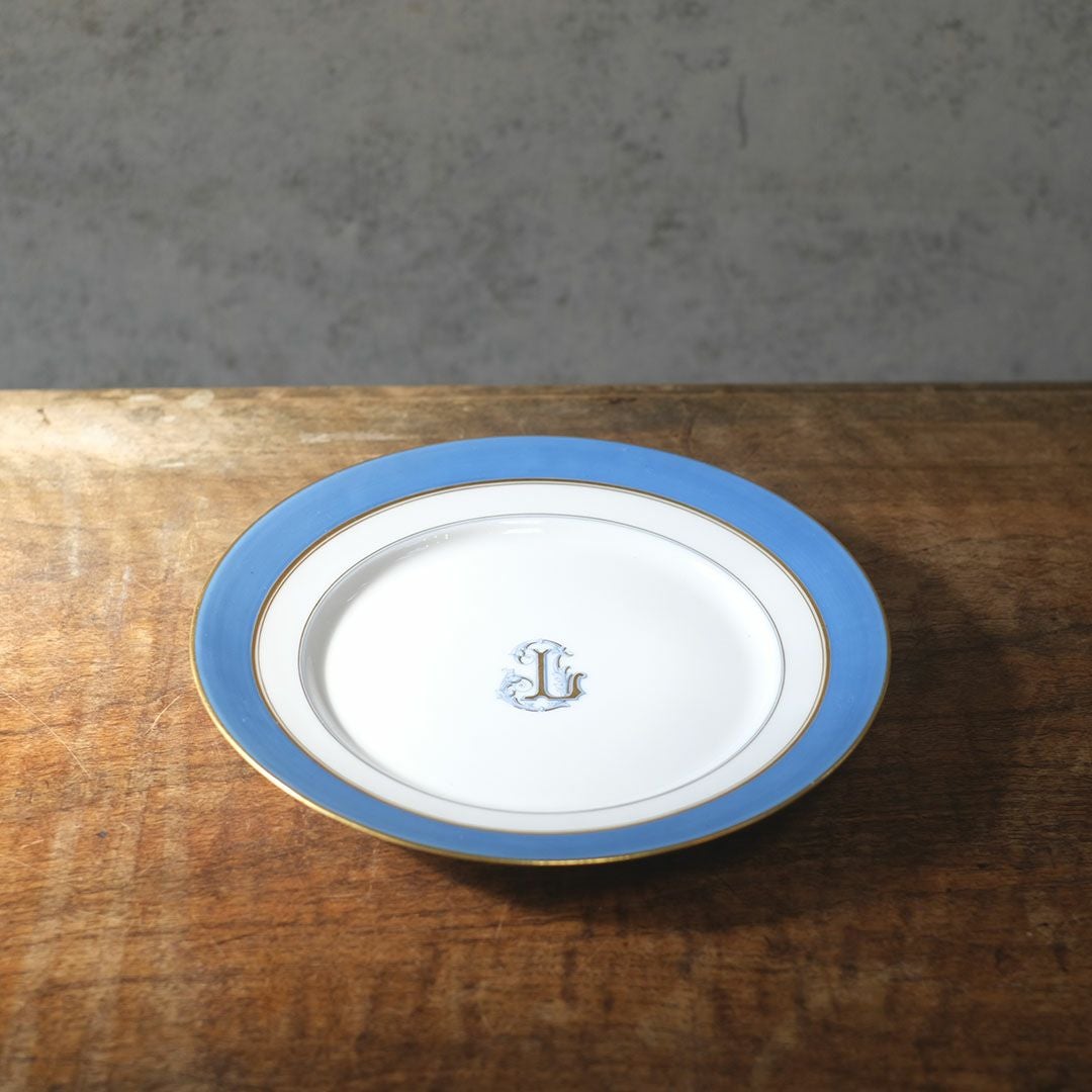 フランスのヴィンテージプレート。中央に優雅なLモノグラム、リムには鮮やかなブルーと繊細な金彩が配された、リモージュ系の上質な白磁です。