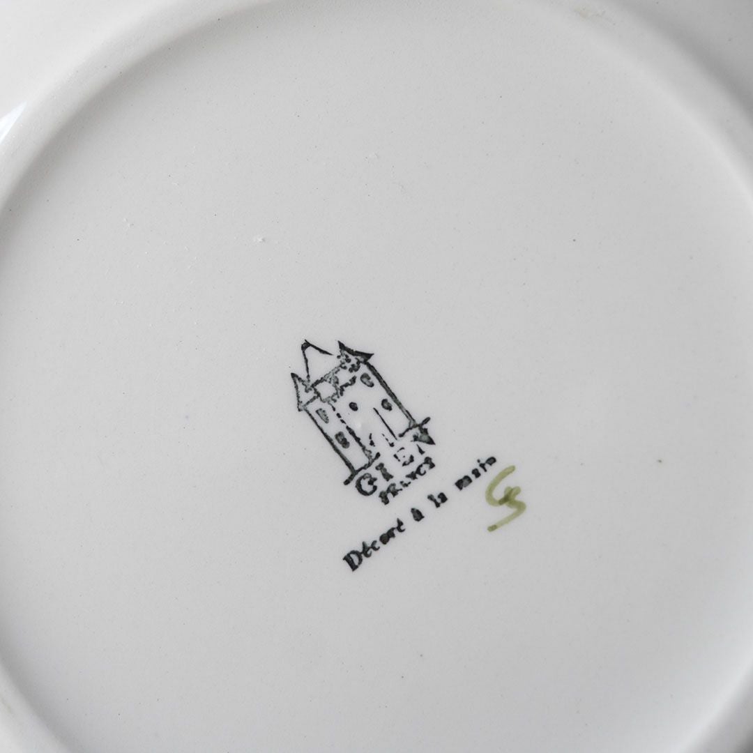 素材はGIENらしいファイアンス(陶器)で、あたたかみのある白地に、しっとりとした表情。メーカー側もファイアンス職人の手仕事を強みとしており、本品も裏面にDécor à la main(手描き装飾)表記が入るタイプです。