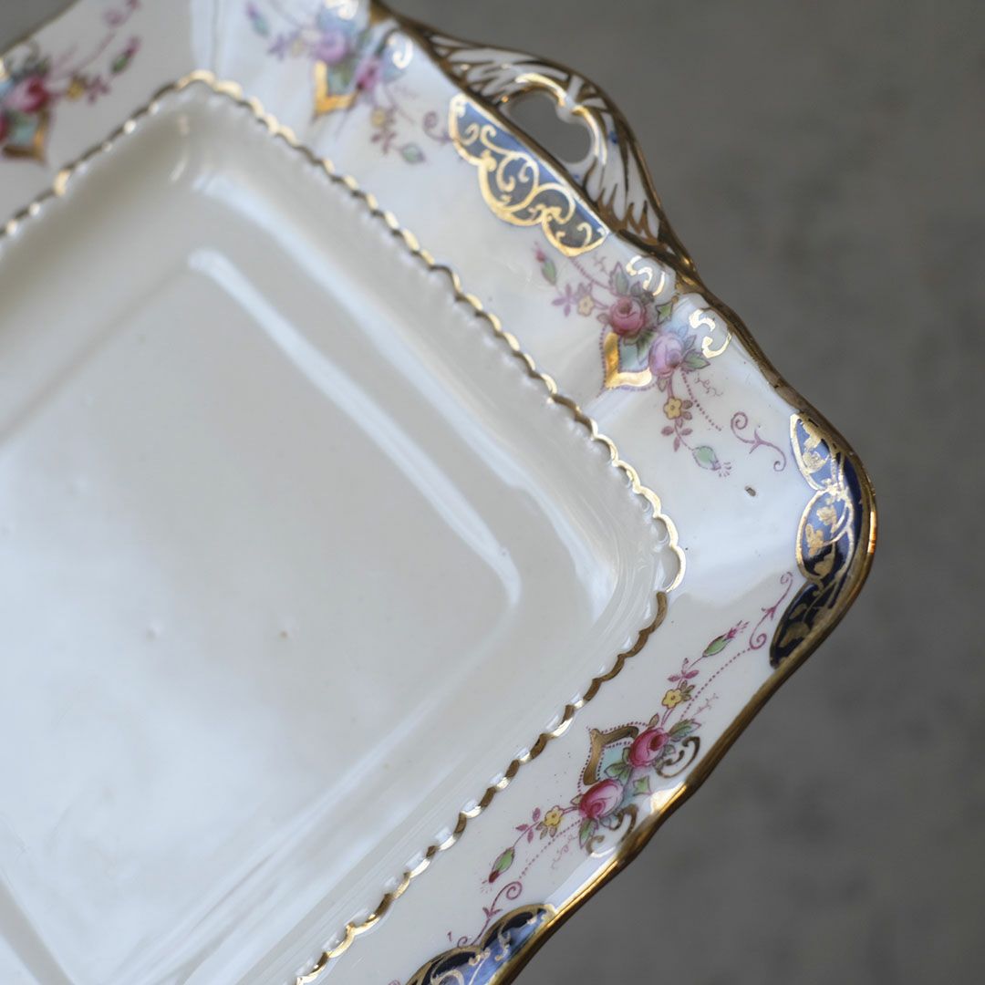 角縁はスカラップ状に波打ち、内側にも細かなレリーフの段差が付けられた手の込んだつくり。両サイドには透かし入りのハンドルが付き、金彩で縁取られた曲線がエレガントなアクセントになっています。ケーキやスコーン、フィンガーサンドなどを盛りつければ、まるでホテルのアフタヌーンティーのような雰囲気に。