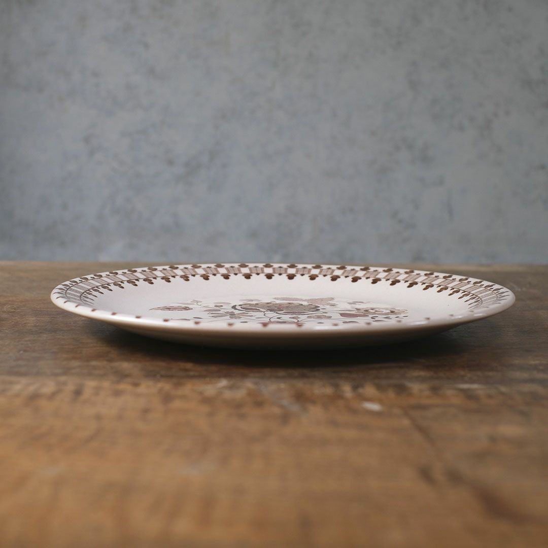 こちらは、そんな同社がかつて手がけていた「オールドグラナイト」シリーズの一品。ほんのりと温かみのあるクリーミーブラウンの地に、繊細な花柄と抽象的なボーダーが施された、クラシカルかつ個性的なデザインが印象的です。