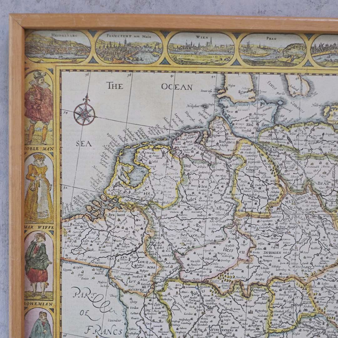 17〜18世紀頃のヨーロッパ地図をもとにしたリトグラフプリントで、ドイツ各地の街並みと衣装風俗が細やかに描かれています。