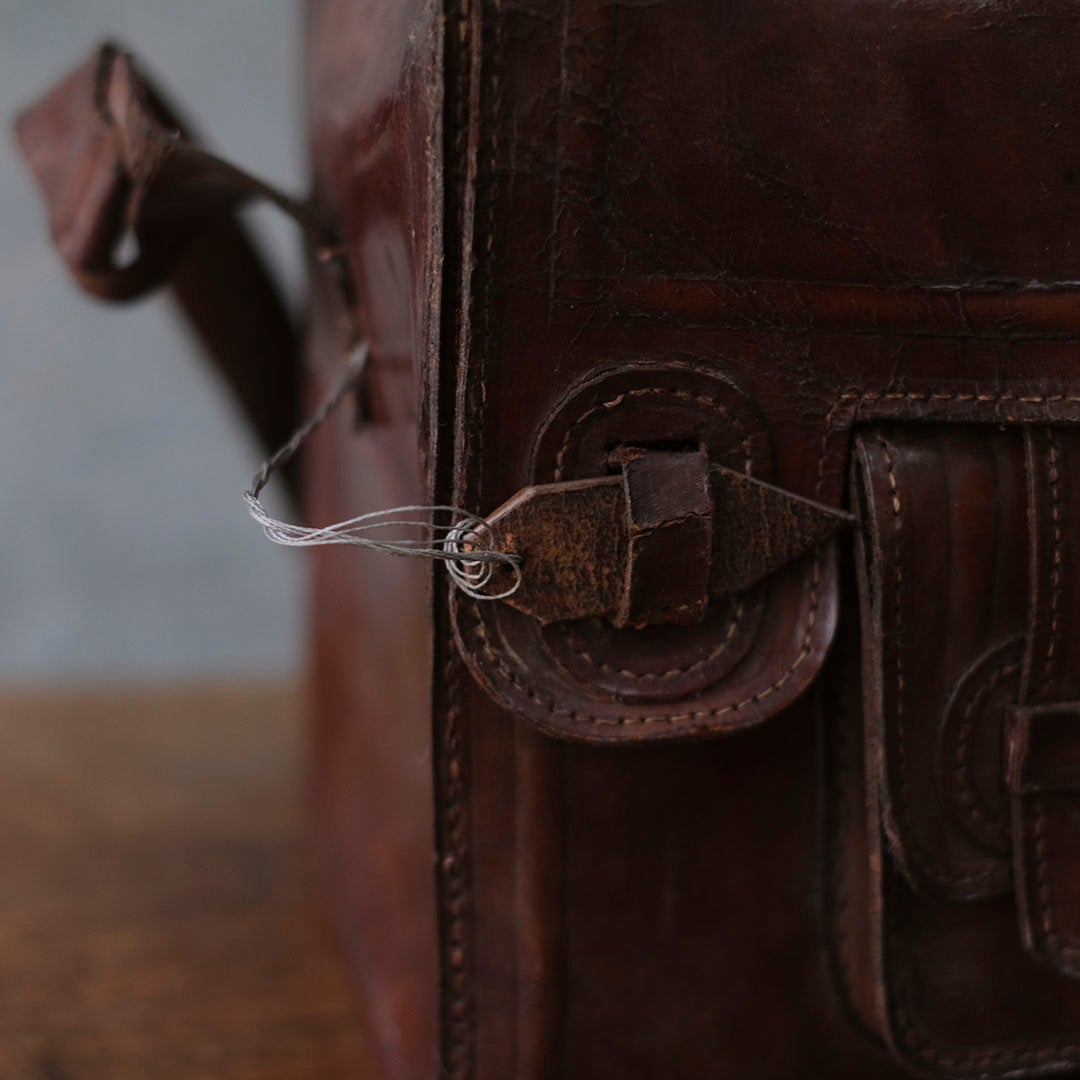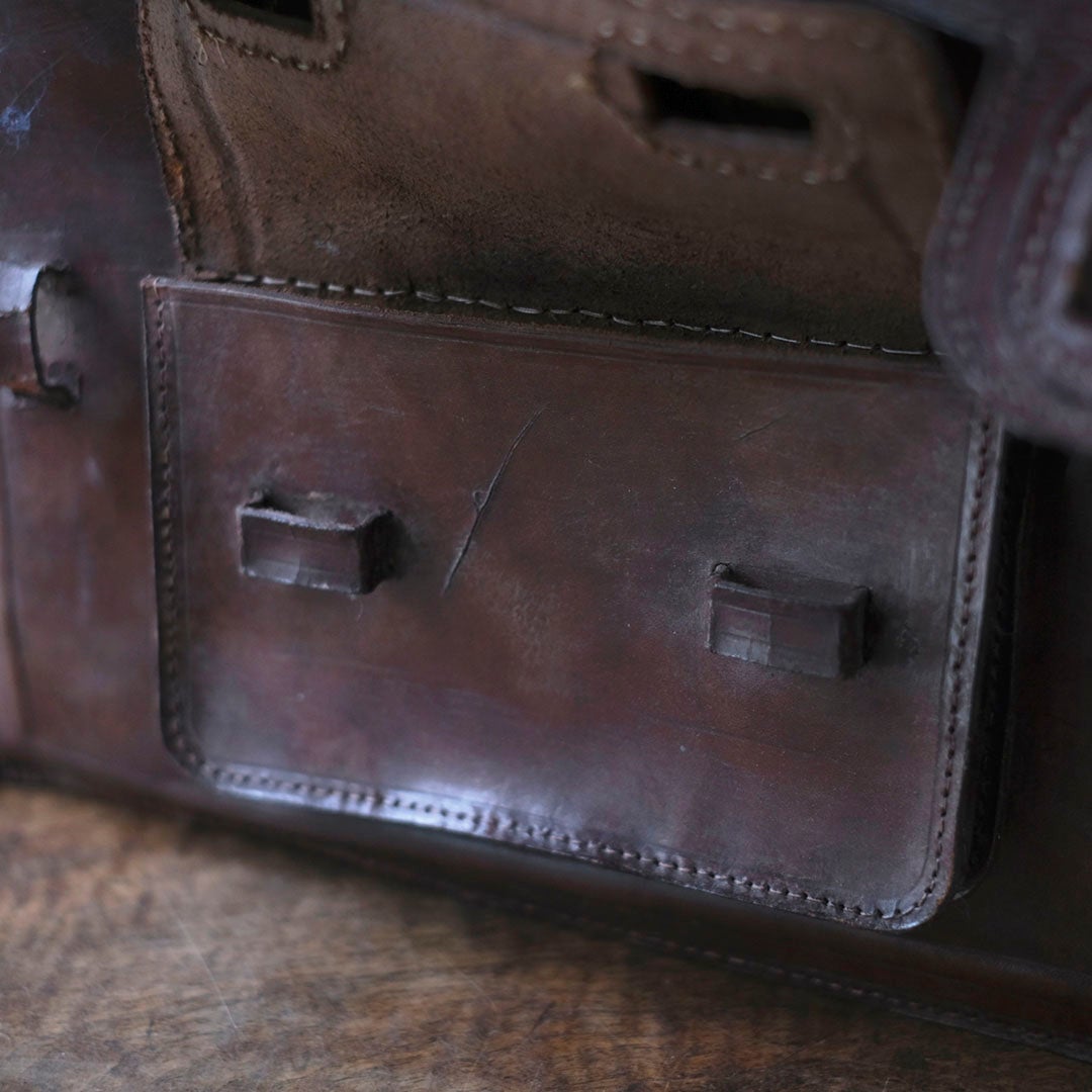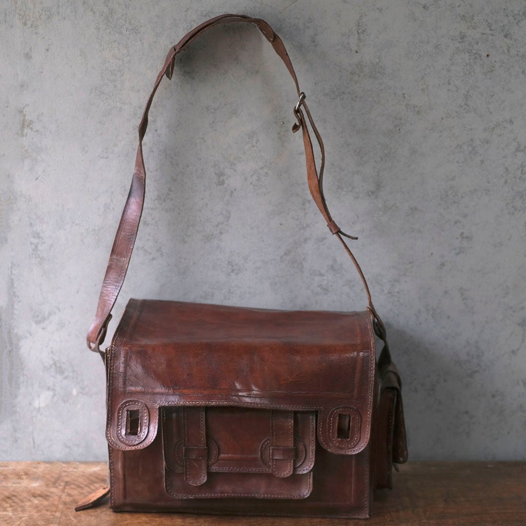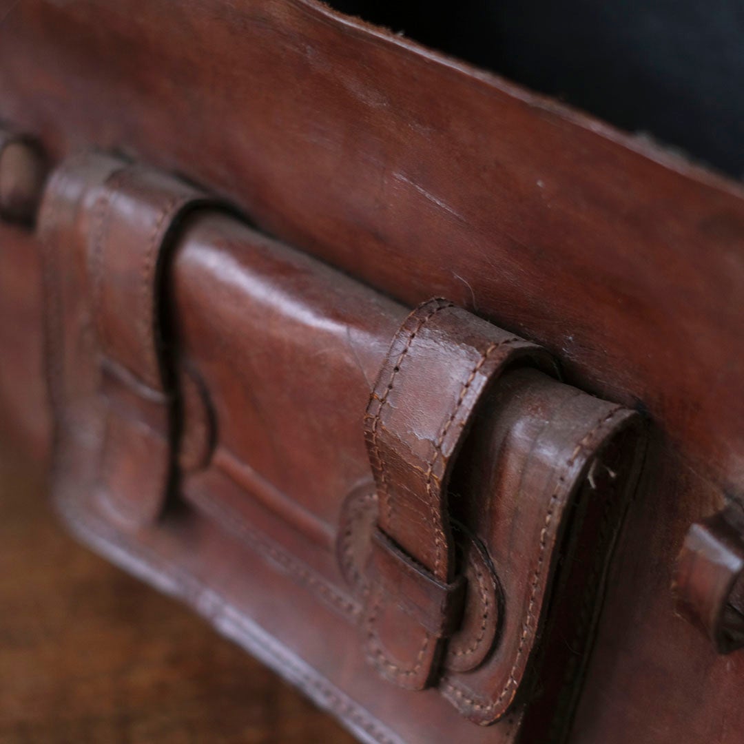 長い旅路を共にしてきたような、深い陰影を纏ったアンティーク・レザーバッグ。現代の既製品にはない、力強くもどこか温かみのある革の表情が、手にする人の日常に確かな深みと知性を添えてくれます。