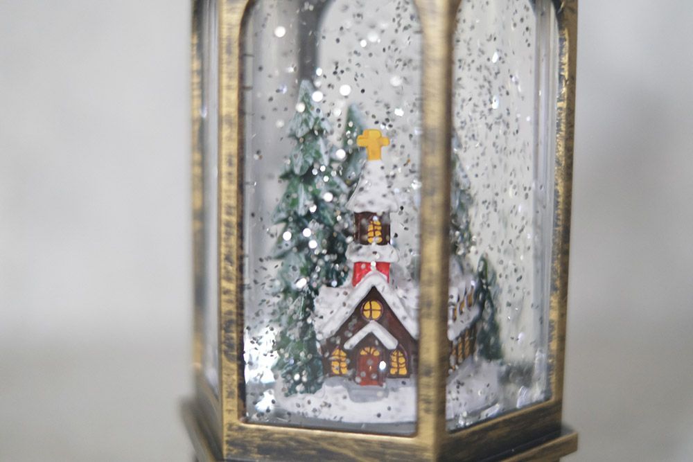 ランタン型のスノードームのような雰囲気で一見メタル製に見えますがエイジングペイントが見事なプラスティック製。液体が入っているので重さがあり安定しています。沖縄県は航空便での配送のためお届け不可となりますのでご了承ください。