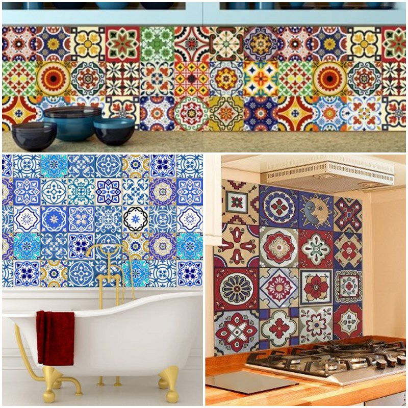 壁面やカウンタートップに並べて貼ると華やかで楽しい空間になります。DIYには通常ホームセンターなどで売られているタイル用接着剤や目地材をお使いください。