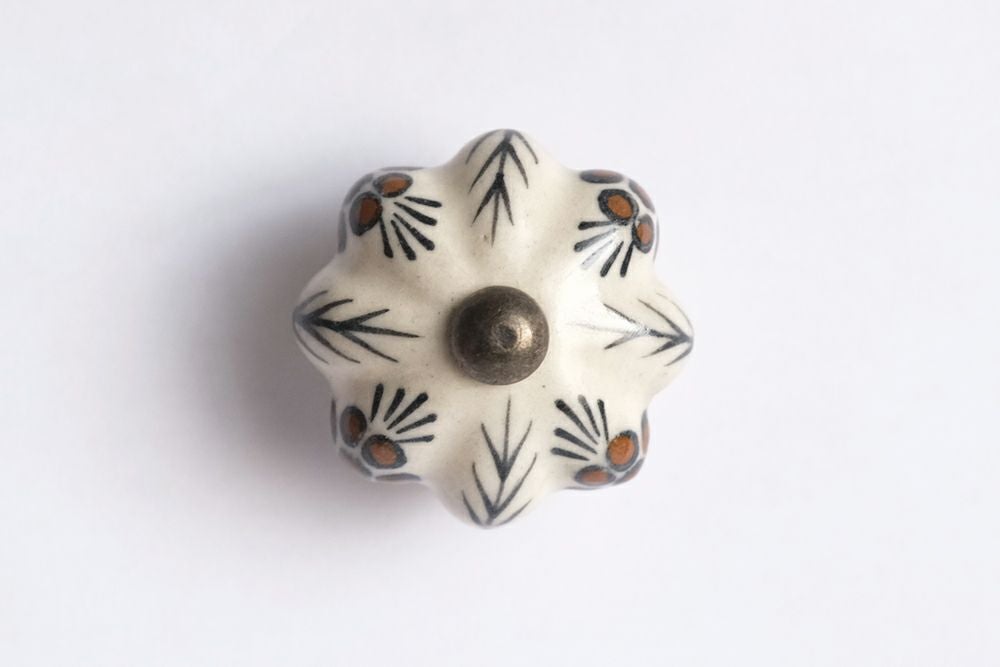 エキゾチックなエスニックスタイルのデザインが可愛い引き出しやキッチンの扉、下駄箱に使える陶器の取っ手です。 裏側からナットで留めるだけなのでDIYで設置も簡単。