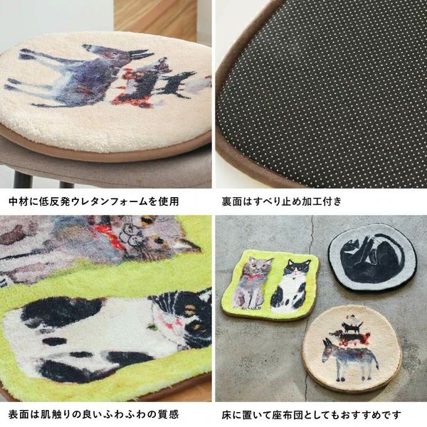 イラストが描かれた座面はふわふわとした質感で、冬場の冷たい椅子や床にも最適です。