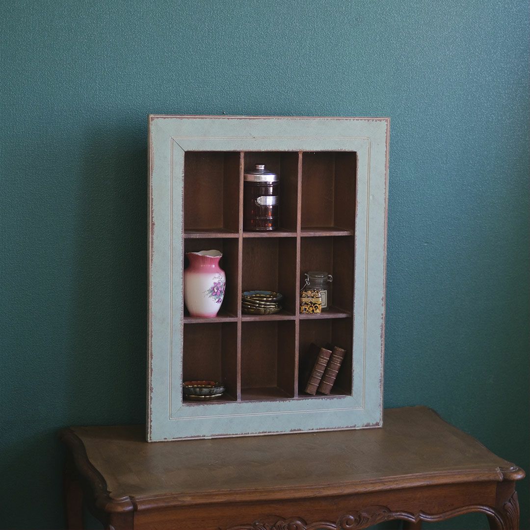 壁に掛けても、立て掛けても楽しめる飾り棚。9マスある小さな棚に小物を並べてかわいいディスプレイが楽しめます。