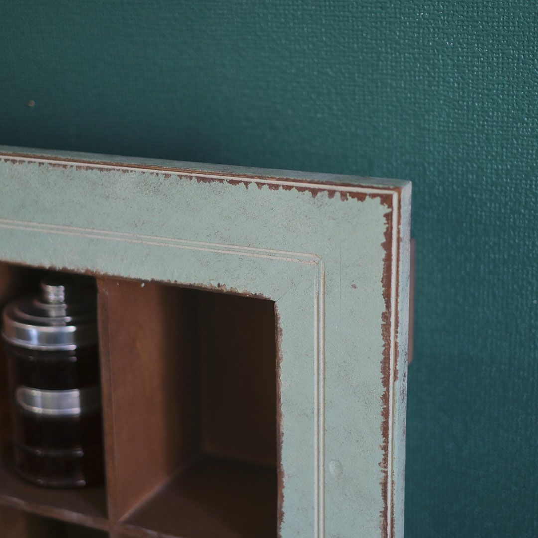 フレームはエイジングペイントされヴィンテージのような存在感があります。 背面にはビスに引っ掛けて飾れる仕様になっています。新築やリノベーションをお考えの 方はニッチ棚として壁に埋め込んで使うのもおすすめです。