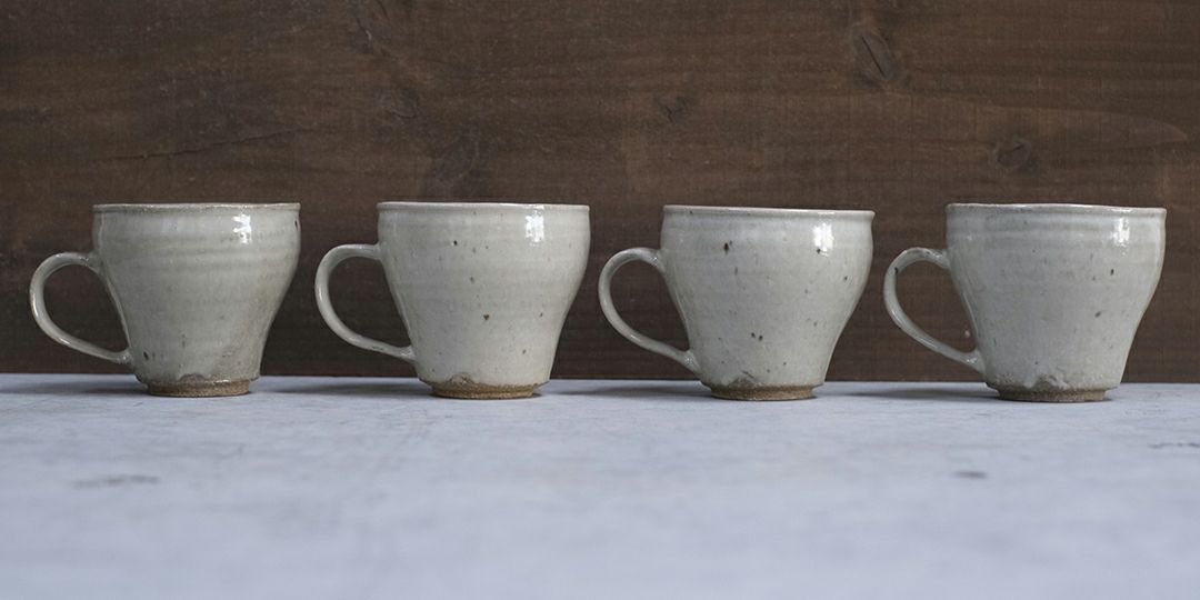 麦窯・岡泰造にによるマグカップ。ワラ釉薬と呼ばれる、原料にワラの灰を使用した釉薬による素朴な風合いが魅力的なうつわです。