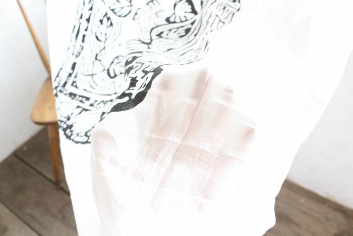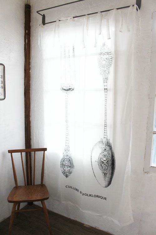 版画のような味わいのある陰影とラインが印象的。幅は110cmとそれほど大きくなく遮光性がない生地なので空間を仕切るパーテーションの