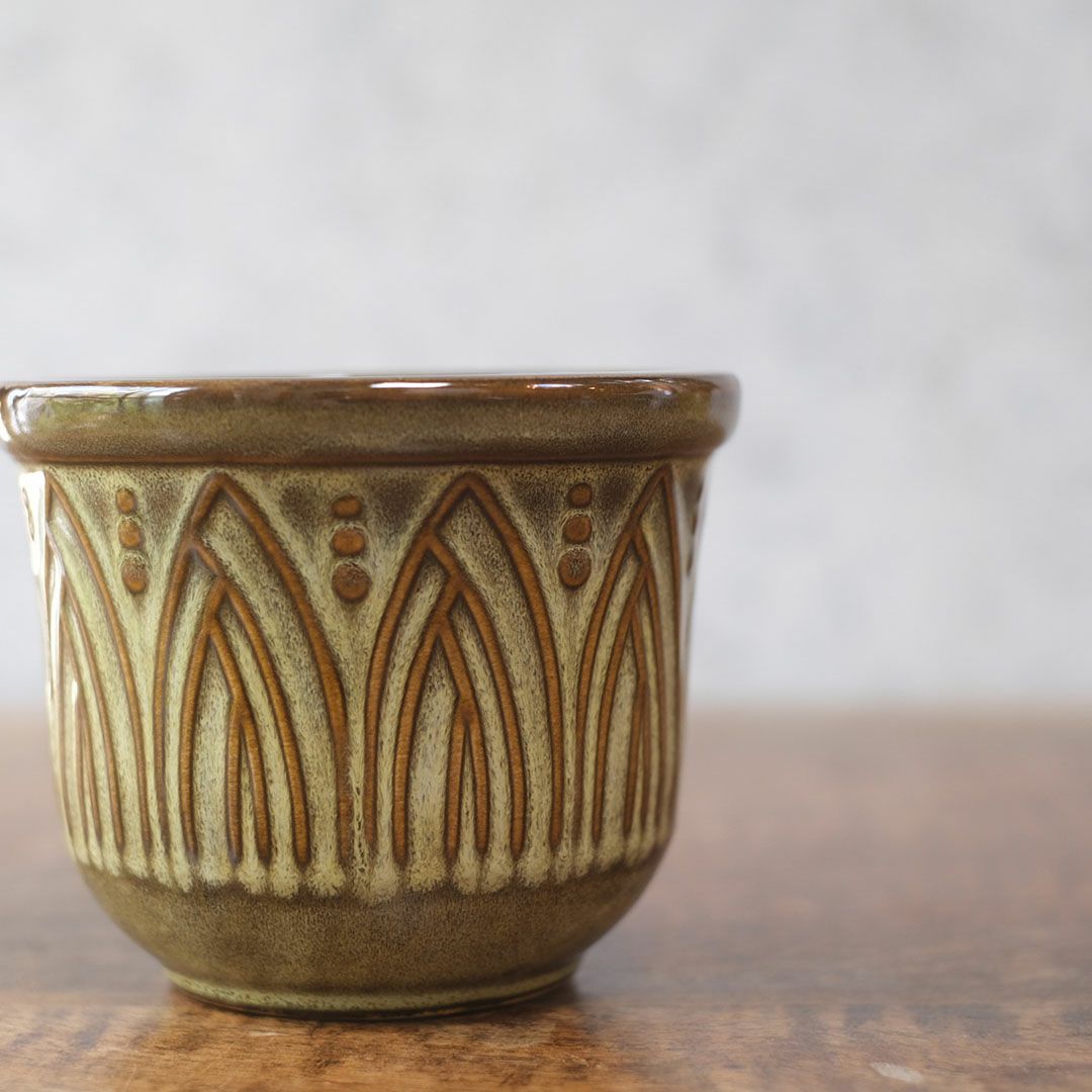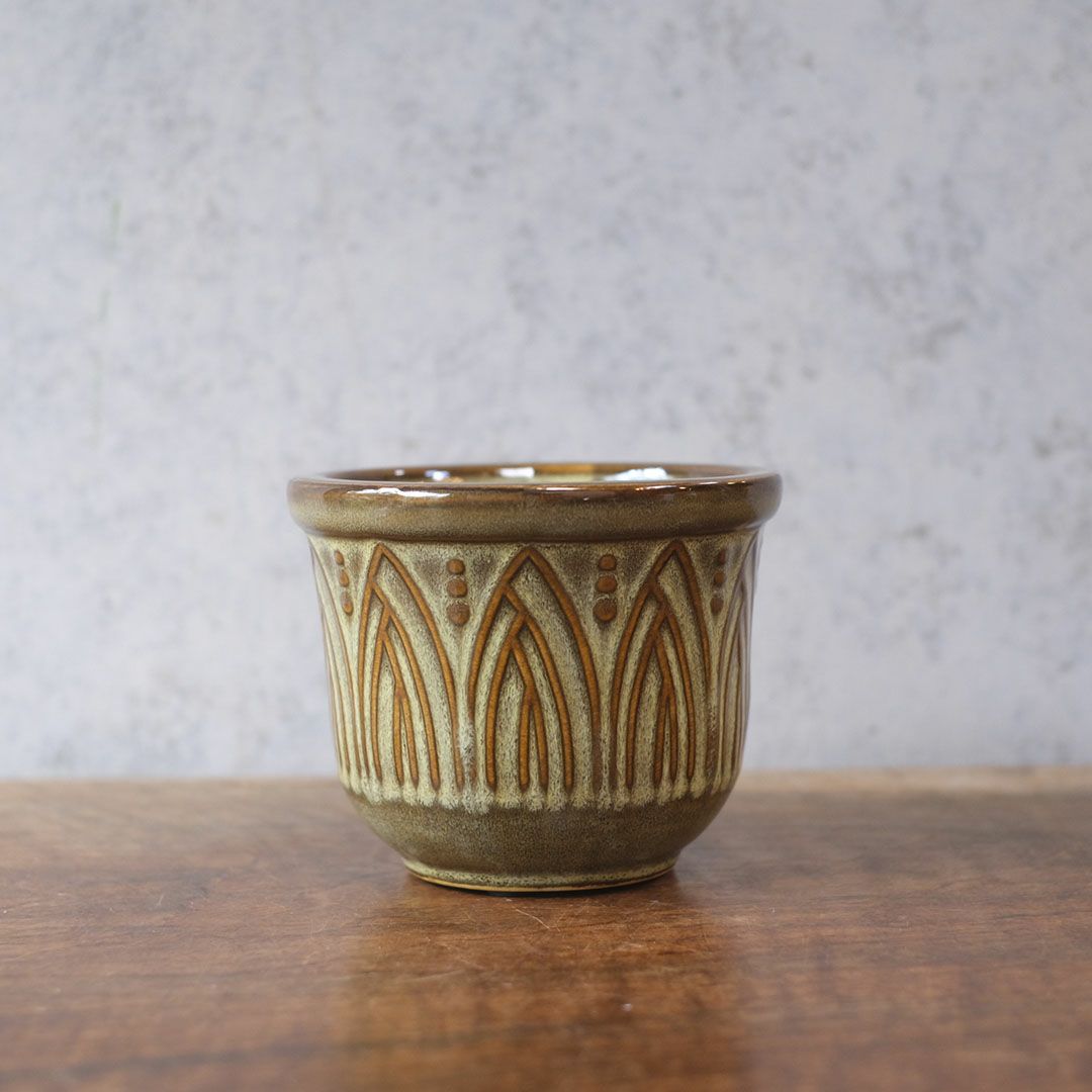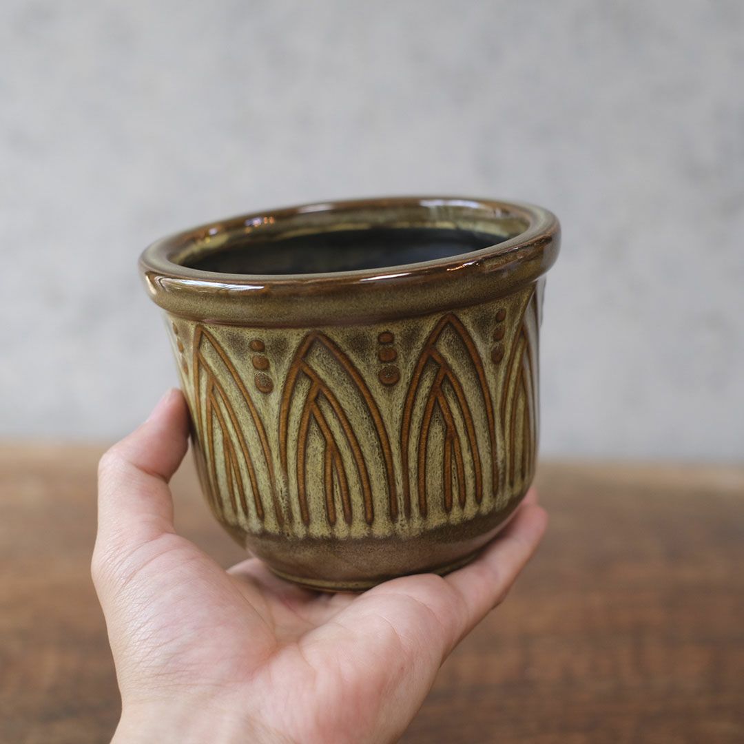 柔らかな光と釉薬の陰影が植物を包む 北欧の温もりを感じる、アーチ模様の陶器プランター