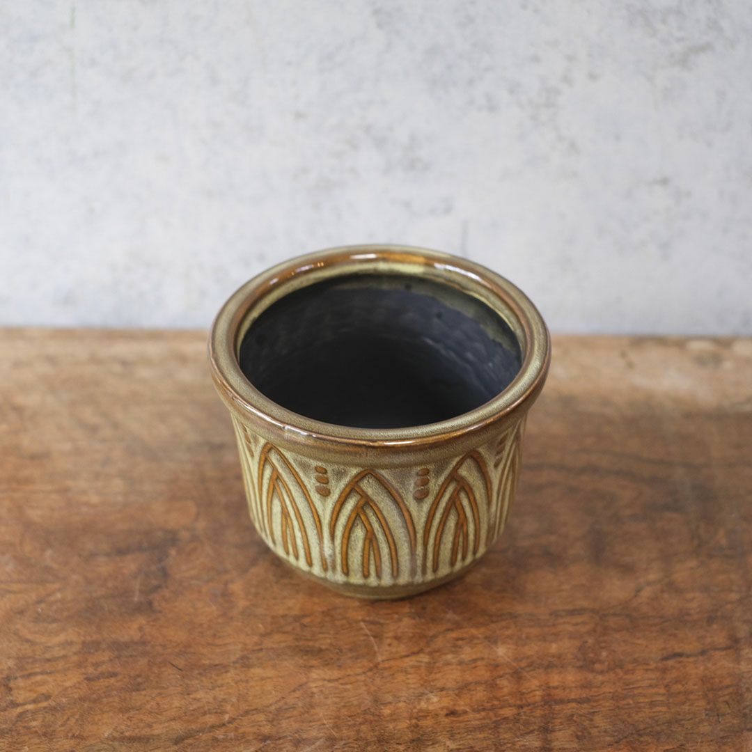柔らかな光と釉薬の陰影が植物を包む 北欧の温もりを感じる、アーチ模様の陶器プランター