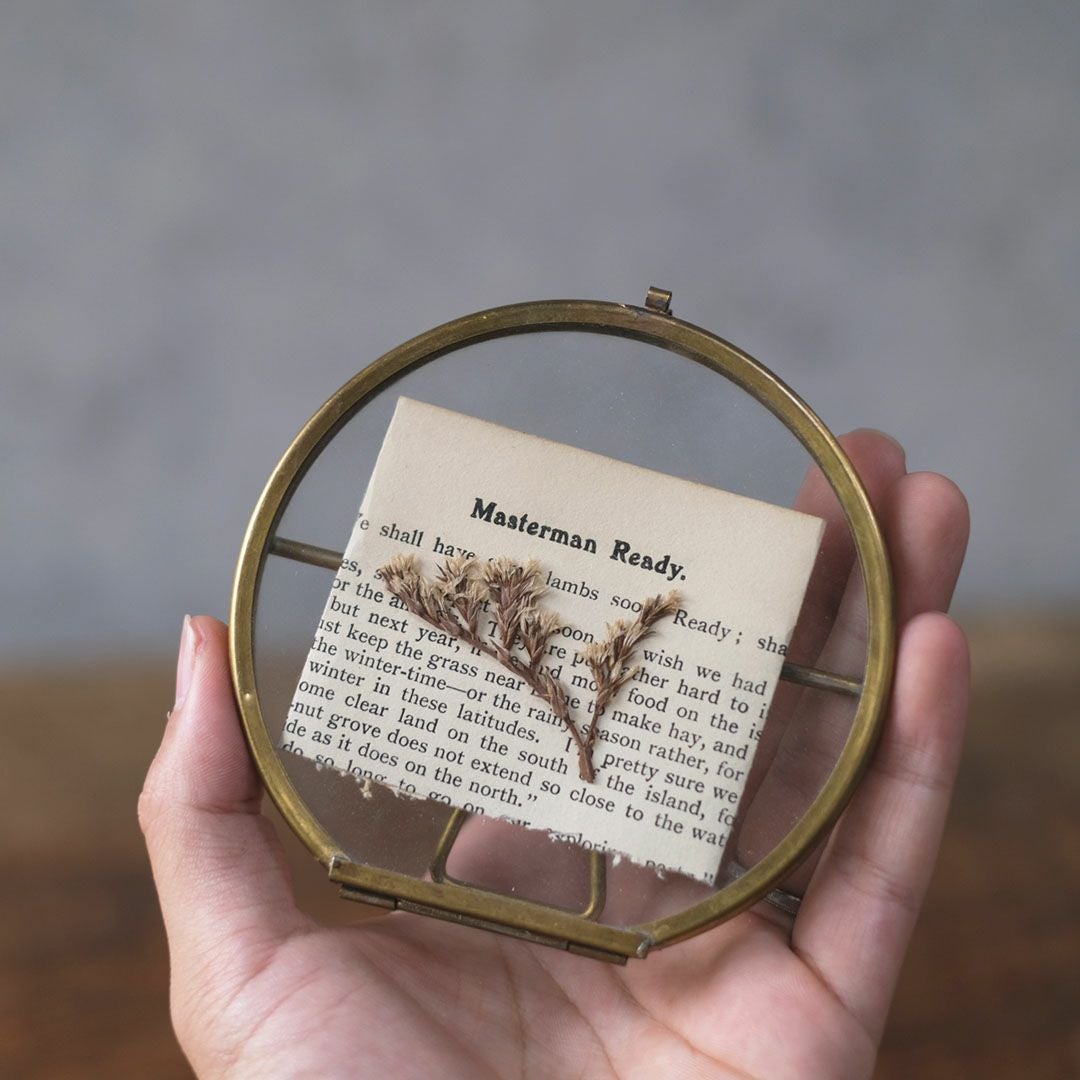 全面ガラス張りでフレームのみ真鍮で製作されたおしゃれなラウンド型フォトフレームです。 シンプルなデザインですがヴィンテージライクな雰囲気が素敵です。直径10cmのSサイズの販売ページです。