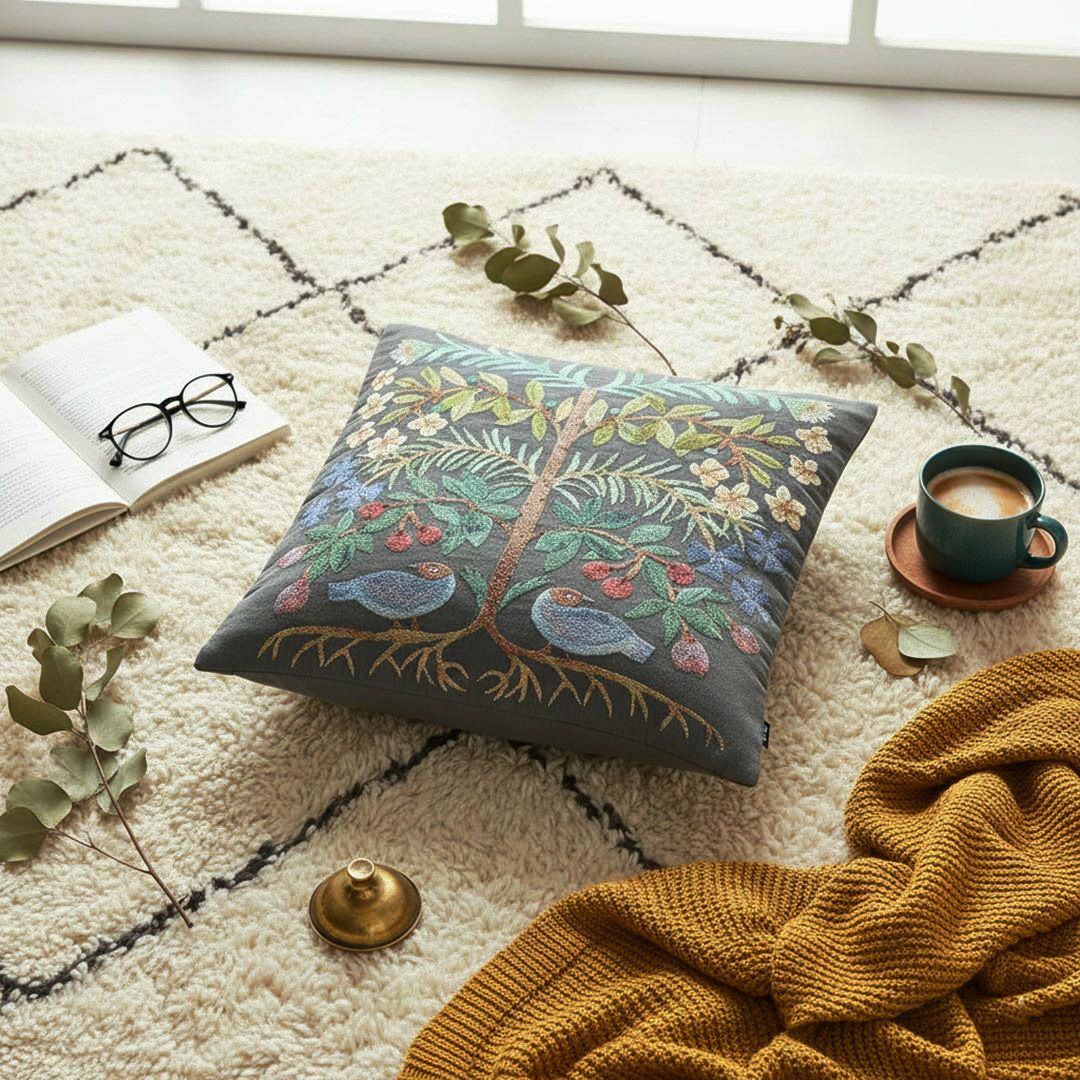 青を基調とした上質なゴブラン織りの生地に、豊かな枝葉と果実のモチーフ、可愛らしい小鳥がデザインされています。